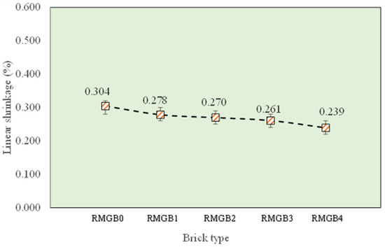 The durability of the RMGB was assessed by testing its water absorption, efflorescence, and drying linear shrinkage. The results of the water absorption test are presented in Figure 6. The addition of RSM increased the mean water absorptivity by 10.9%, 14.5%, 12.4%, and 14.4% for RMGB1, RMGB2, RMGB3, and RMGB4, when compared to RMGB0, respectively. In spite of the increase in the water absorptivity, the values were still observed to be within the limits specified by the IS 1077-1992. The increase in water absorption can be accredited to the random distribution of the shredded RSM fractions within the brick, which results in void spaces that allow water permeation. The results of the efflorescence test are shown in Figure 7. Efflorescence is due to the presence of free alkalis in the geopolymer brick. In this study, the efflorescence was observed to be constant for all the brick types, and it was not influenced by the RSM. The level of efflorescence was between slight and moderate, as per IS 3495 specifications. There are several factors that influence efflorescence in geopolymer mixes. For example, in silica-rich geopolymer systems, the leaching of free alkalis is more serious due to the low content of alumina [40]. Furthermore, alumina in the binder enhances the crosslinking in the geopolymer matrix and inhibits the movement of the alkalis, which results in lower efflorescence [44]. Besides, in ambient cured geopolymer bricks, the degree of reaction is enhanced with time, and this assists in the consumption of the alkalis till the expanse of reaction, which causes a reduction in efflorescence. Since efflorescence was determined after 28 days of curing, it can be expected that there will be some reduction in efflorescence with the aging of RMGB. The results of linear drying shrinkage are shown in Figure 8. The reduction in shrinkage was due to the addition of RSM fibers, and this can be attributed to the internal shear resistance offered by the fibers. Similar findings have also been reported when polypropylene fibers have been introduced in cement matrices [45]. On the whole, the addition of RSM into geopolymer bricks did not influence the durability properties. In contrast, the RSM fibers reduced the shrinkage in RMGB, and this will positively influence the performance of bricks in service since excessive drying shrinkage in the bricks can result in unwanted cracks, thus reducing the service life of the masonry structures.