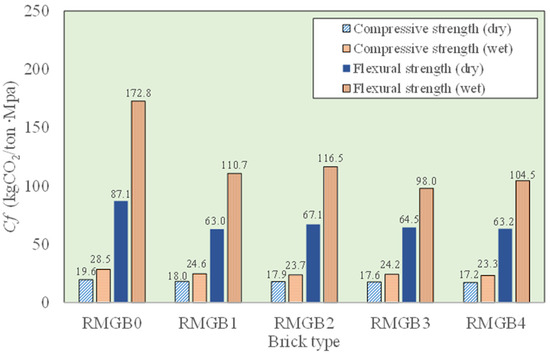 The CO2 emissions in the raw material phase significantly impact the product’s overall carbon footprint. Among the raw materials used to produce the bricks, the RSM is a novel perspective, and CO2 emissions associated with its processing need to be dealt with (refer to Table 3). The fresh surgical masks were ground to obtain the RSM. However, in the actual production process, the waste surgical mask would require sterilization to ensure public safety; the method of sterilization can be found in existing literature [46]. As a result, the emissions from sterilization in an 800 W microwave oven at 70 °C were taken into account for CO2 evaluation. A duration of 60 s each for sterilization and grinding was considered, and the sterilization process consumed 0.52 kWh, and grinding consumed 0.332 kWh of power to obtain 1 kg of RSM. The emission factor for electricity consumption was considered to be 1.043 kg CO2/kWh, which was obtained from the Agribalyse database (Version 3.0.1) using IPCC 2013 GWP100a methods in OpenLCA (version 1.11.0) [47]. The CO2 equivalent values (refer to Table 4) for GGBS and sand were derived from published studies [48,49], and the emission value of Na2SiO3 from [48,50]. In the present evaluation, RHA was considered to have no CO2 emission in the extraction phase since it was obtained from waste landfills. The material transportation emission factor of 0.0877 kgCO2/ton·km was considered because materials were transported by freight vehicles with a capacity of ≤3.5 tons [51]. The production phase involves several manual processes, such as mixing of materials, molding of the bricks using the Mardini press, and dry curing at ambient temperature. The embodied emission of equipment used to manufacture bricks is not accounted for since the emphasis was on the raw material processes. Moreover, the brick pressing process was manual, so the emissions can be considered to be nil. The carbon footprint of the produced RMGB was evaluated by considering the inventory data adjusted to one ton of bricks, as shown in Table 4. The emissions were derived as per the inventories of 1 ton of bricks, as shown in Table 5, and the final emission values in kgCO2/ton were obtained as 100.20, 100.76, 101.32, 101.88, and 102.44 for RMGB0, RMGB1, RMGB2, RMGB3, and RMGB4, respectively. The emission values of the brick increased from 0.56% to 2.23% with an increment in the RSM from 1% to 4%, respectively, when compared to the brick with 0% RSM. From the analysis, it is evident that there was a marginal increment in emissions with the addition of RSM in the bricks, and furthermore, the increase in emissions of RMGB was deliberated with the mechanical performance of the bricks, as shown in Figure 9. The reduction in Cf values indicated the better sustainability of RMGB. For example, the inclusion of RSM in bricks reduced the carbon emission per MPa in the range of 7.90% to 18.26% for compressive strength and 22.9% to 43.3% for flexural strength when compared to bricks without RSM, respectively. This reveals the benefits of RSM in improving material performance and, therefore, it can significantly contribute towards lowering the greenhouse gas emissions in the building sector. All in all, waste surgical masks have significant potential in the construction industry and can be considered as a sustainable additive in improving material performance, leading to better circularity rate in the construction industry. Thus, disposed surgical masks should be considered as a valuable resource for the construction industry.