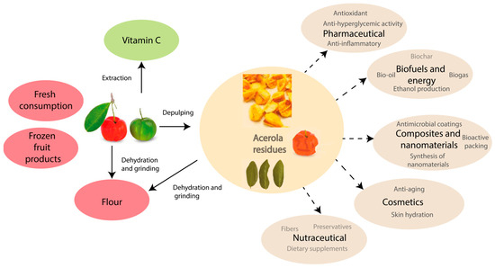 To fill this gap in our understanding and to potentially broaden the fruit’s applications, this review aims to provide an in-depth analysis of the current state of acerola waste research. It will focus on its compositional attributes, pharmacological properties, and additional value-added uses, thereby helping to pinpoint current challenges and opportunities for its more extensive and economically viable industrial applications. Sustainable management strategies and innovative approaches could further elevate their value and utility. Figure 1 presents a scheme showing the type of industry and possible products that can be derived from the acerola, which will be discussed in this manuscript.