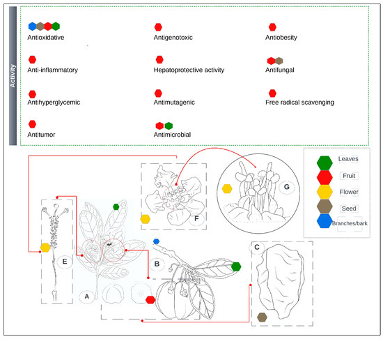 Anatomical structures in the genus Malpighia: (A) M. emarginata with fruiting branch and fruits; (B) approximation to fruiting branch for a most detailed view; (C) seed type—pyrene; (E) racemose inflorescence with bibracteolate peduncule from M. romeroana; (F) typical Malpighia flower; (G) approximation to Malpighia spp.’s reproductive structures (styles/stamens). Based on Woodson et al. (1980) and Brücher (1989) [20,21]. Colored hexagons identify the plant structure mentioned above. The upper side shows the different activities associated with the acerola extracts. aNScientific reviews from the last decade are cited below, identified by the color according to the plant structure analyzed. No literature was found concerning the properties of the Malpighia spp. flowers (figure self-made). References for Activity: Antioxidative: [22,23,24,25]; Anti-inflamatory: [16], Antihyperglycemic: [16], antitumor: [26] Antigenotoxic: [27]; Hepatoprotective: [16,28,29], Antimutagenic: [16], Antimicrobial: [17,24], Antiobesity: [25]; Antifungal: [22,30], Free radical scavenging: [30].