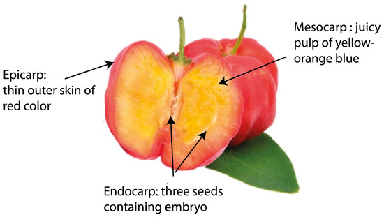 Morphological aspects of acerola fruit (Malpighia emarginata) and its associated structural elements (figure self-made).