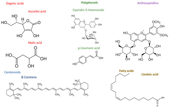 Chemical structure of some compounds reported to be present in the acerola: ascorbic acid [10], carotenoids [56], polyphenols [57,58], and fatty acids [52].