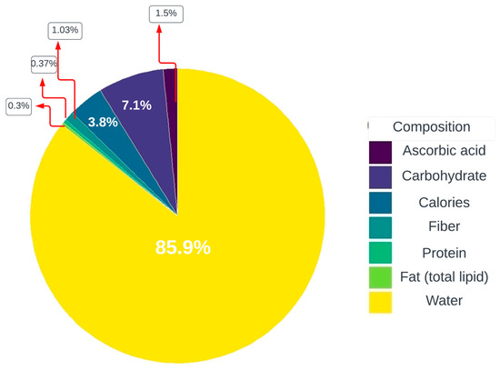 Figure 5 shows a pie chart showing the % of the composition of acerola based on 100 g of fresh weight. Acerola is an important source of several macro- and micronutrients, such as ascorbic acid. It is one of the most important water-soluble vitamins, essential for collagen, carnitine, and neurotransmitter biosynthesis [7]. Table 2 shows pulped acerola residues’ physical, chemical, and total antioxidant activity [59]. Volatile compounds such as furfural, hexadecanoic acid, 3-methyl-3-butenol, limonene, and 3-methyl-3-butenol have been isolated from acerola [60].