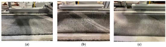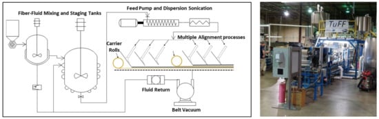 The TuFF wet-laid process [18,19] uses a fluid reservoir containing suspended fibers connected to a deposition surface over a moving belt. A schematic and a photo of the alignment process is shown in Figure 1. The short fibers can be any type of fiber or combination of fibers (carbon fibers, glass fibers, ceramic fibers, metal fibers, polymer fibers, natural fibers, recycled fibers, and nanofibers) with different aspect ratios if desired. Fiber dispersion at the filament level is critical to create a defect-free TuFF sheet. The fibers are spread uniformly on the sheet surface and deposited on the porous belt. Fibers are highly aligned at the deposition belt surface, fluid is extracted through the porous belt using a vacuum, and the fiber material is stabilized. The deposition sheet can be rotated to position fibers at a wide range of widths and angles with respect to the belt travel direction to create tows, tapes, and sheets. Previous studies have demonstrated full property translation in TuFF CFCs with virgin, 3 mm-long CFs, and thermoplastic matrix [14,15]. This work explores the use of rCFs and its challenges creating full property translation using the TuFF process.