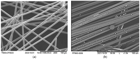 SEM of (a) vCFs showing random orientation indicating good separation (left, 600×) and (b) rCF fibers with residue and bundling of fiber agglomerates (right, 1000×).