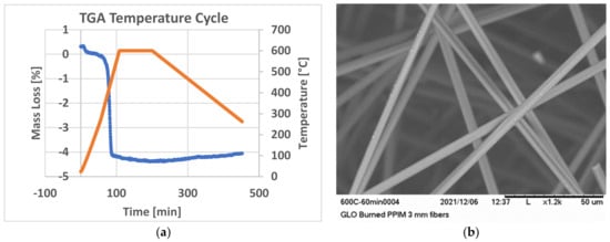 The cycle is replicated in the TGA (Figure 3a) and shows no significant weight loss during the dwell and cooling process. The resulting cleaned rCF (cCF) batch is dispersed in water and SEM pictures taken (Figure 3b). These fibers are seen to be randomly oriented without any visual residue, indicating that fibers are dispersed at the filament level. This cleaning cycle used for other rCFs will depend on the polymer composition and recycling process used to recover the rCFs. Further optimization of the dwell cycle is also possible, reducing cycle time and energy cost, but is not part of this study.