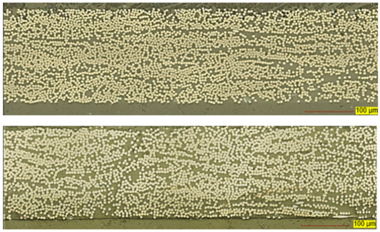 Optical microscopy images are captured using a 20× lens and the VK-X200 3D Color Laser Scanning Microscope, providing a resolution of 0.2 μm per pixel. Typical vCF and cCF cross-sectional images are shown in Figure 10. The microscopy images show low porosity (less than 2%) with some resin rich areas from a small number of misaligned fibers typically observed in TuFF coupons. Image analysis confirms FVF of around 50% as designed with the ratio of resin and fiber areal weight used in the autoclave process.