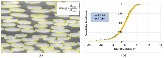 (a) Example micrograph of a 15°-cut for fiber orientation (left), and (b) resulting fiber orientation distribution (right).
