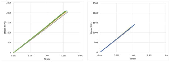 Five samples of each vCF and cCF TuFF panel are tested, and the stress–strain curves are shown in Figure 12. The stress–strain curves of the two composite panels are very similar until failure. However, the cCF panel had a significantly lower failure strain. This indicates comparable modulus for the two composite material with the cCF material exhibiting a lower strength. Failure strain of the vCF samples ranges from 1.47% to 1.63% and are slightly lower than the Toray datasheet failure strain at 1.67%. In contrast, the failure strain of the cCF samples is between 0.62% and 1.09%. This significantly lower failure strain results in the reduced average strength of the cCF composite.