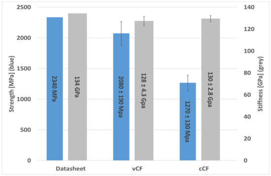Using the tensile properties from the Toray datasheet for T800H unidirectional prepreg normalized at 48% FVF, the tensile strength and modulus is determined to be 2340 MPa and 132 GPa, respectively. The TuFF material produced using the vCF and cCF has a nearly identical tensile modulus of 128 ± 4.3 GPa and 130 ± 2.8 GPa, respectively, with both within one standard deviation of the Toray datasheet values. In addition, the stiffnesses are very repeatable, with an experimental coefficient of variation within 2–3%. In contrast, both TuFF samples had strength reductions compared to the Toray continuous fiber datasheet values. The vCF TuFF tensile strength is 2074 ± 190 MPa and the cCF TuFF tensile strength is 1270 ± 130 MPa. The vCF TuFF material has approximately 90% strength retention compared to the continuous sample while the cCF TuFF material retention drops to 55%. The cCF strength reduces by approximately 40% compared to the vCF coupon strength. The coefficient of variation for strength for both samples is higher, around 9–10%, which is not uncommon for composite tensile test results. Figure 13 summarizes the mechanical results in a graphical display.