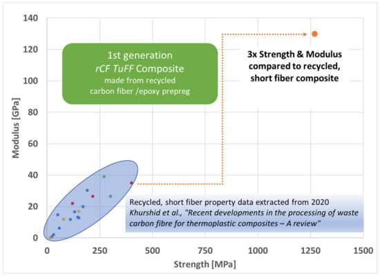 Figure 14 compares our cCF TuFF properties with data from a recent review paper [9,10] of short, recycled carbon fiber composites. The cCF TuFF composite exceeds any reported short, recycled carbon fiber tensile properties by a factor of three, showing the significant property improvement possible with a highly aligned fiber material incorporating recycled fibers with full strength retention.