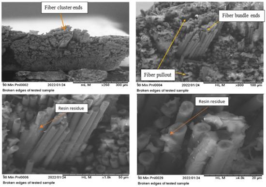 SEM images of cCF failure surface show fiber cluster ends and fiber pull-out (top) with resin residue observed at higher magnification at the fiber ends (bottom).