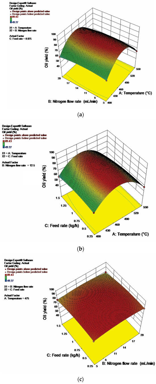 3D Response surface plot for the interactive effect of all factors and their mutual interaction on the oil yield (PP): (a) effect of temperature and nitrogen flow rate; (b) effect of temperature and feed rate; (c) effect of nitrogen flow rate and feed rate.