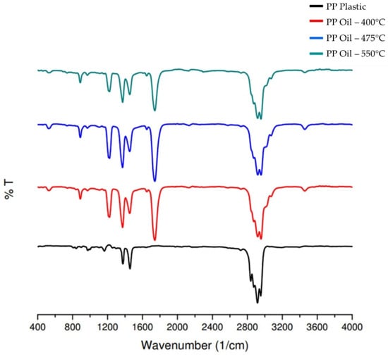 The results of the FT-IR analysis of the plastic wastes and fuel oil produced at different temperatures (400, 475, and 550 °C) are presented in Table 3. For the waste PP grocery bags, alcohol and phenols were detected by O-H stretching and H-bonded vibrations at a wavenumber of 3394.1 cm−1 (Figure 2). The presence of carboxylic acids was detected at 3188.72 cm−1 for O-H stretching vibrations. C-H and CC stretching vibrations indicated the presence of alkanes and alkynes at wavenumbers of 2952.48, 2915.84, 2873.42, and 2194.60 cm−1, respectively. Also, the C-H bending vibration indicated the appearance of alkanes at 1455.90 cm−1, and alkenes were determined at wavenumbers of 972.912 and 839.85 cm−1 with =C-H bending vibrations. Similar functional groups were observed in the PP fuel oil. Also, the presence of esters and saturated aliphatic were determined by a C=O stretching vibration at a wavenumber of 1741.41 cm−1. The C-N stretching vibration indicated the presence of aliphatic amines at wavenumbers of 1221.68 and 1158.04 cm−1. Higher wavenumbers were found in the spectrum’s initial phase and middle index in the FT-IR spectra, representing the small and bulky functional groups. At the same time, low wavenumbers represented double- and single-bond functional groups (alkanes, alkenes, alkynes, etc.). These results show that plastic waste and derived fuel oil had different hydrocarbons, mostly alkanes, alkenes, and alkynes, and were coincident with the results reported by [66]. The FT-IR data obtained in this study are in better agreement with some of the literature. The FT-IR spectra of the PP fuel oil obtained at 300 °C exhibited the major peak of aliphatic C-H stretching at the wavenumbers of 2960–2840 cm−1. The olefin C=C stretching was indicated at the peak of 1520–1540 cm−1 and C-H bending vibration (CH2) was shown at 1460–1350 cm−1 [38]. Meanwhile, [64] analyzed the functional group of PP oil obtained through kaolin clay at 400–550 °C. The peaks at 2956 and 2879 cm−1 related to the C-H stretching, and the peak at 1377 cm−1 indicated the bending of alkane. Additionally, the peaks at 1456 and 970 cm−1 were attributed to the C-H stretching and C-H bending of alkene. Similarly, [67] studied the functional group of PP oil produced at 410 °C using a florisil catalyst, and they found several distinct peaks. The symmetric and asymmetric stretching (CH3) was obtained at the wavenumbers of 2954 cm−1 and 2870 cm−1. The asymmetric stretching (CH2) and symmetrical bending (CH3) were shown by the peaks at 2914 cm−1, 1460, and 1377 cm−1, respectively. Also, the peak at 970 cm−1 was attributed to the C-H bending vibration of alkenes, and the peak at 887 cm−1 corresponded to the C-H bending.
