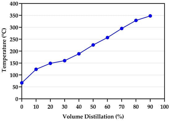 The waste plastic fuel oil comprises a mixture of various hydrocarbons with different carbon ranges. For the fuel application, it is necessary to fractionate the hydrocarbons through distillation. The distillation curve provides information about the distillation of crude oil. Hence, the distribution of the boiling point is representative of the chemical composition of the petroleum crude fraction. Therefore, the ASTM distillation (D86) test was carried out for the fractional distillation of the PP fuel oil. The percentage of volume fractions of different compositions in the PP fuel oil with respect to its boiling temperature range (67–348 °C) is presented in Figure 3. The boiling temperature of the PP fuel oil represents the presence of gasoline, kerosene, and diesel in the fuel oil. The results were coincident with the results reported by [40], which stated that the boiling point of waste PP oil varied from 63–350 °C. Whereas, [41] studied the pyrolysis of PP waste for liquid fuel production with a refinery distillation bubble-plate column and observed the presence of kerosene in tray I, and gasoline in trays II and III. The liquid fuel produced from the waste PP using kaolin and acid-treated kaolin had a boiling temperature range of 68–346 °C and 42–312 °C, respectively [71].