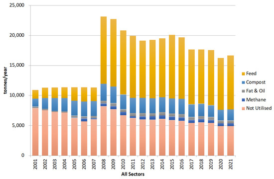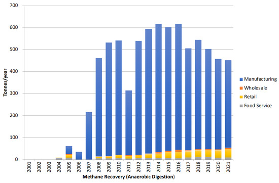 Figure 3 shows the amount of food waste generated by sector [15]. It shows clearly that the amount of food waste generated by the food manufacturing industry is by far the largest. The amount of food waste has been decreasing since 2008. This partly reflects the fact that food supply itself has been in decline in the same period. Although not shown in Figure 3, households generate the second largest amount of food waste after the manufacturing sector.