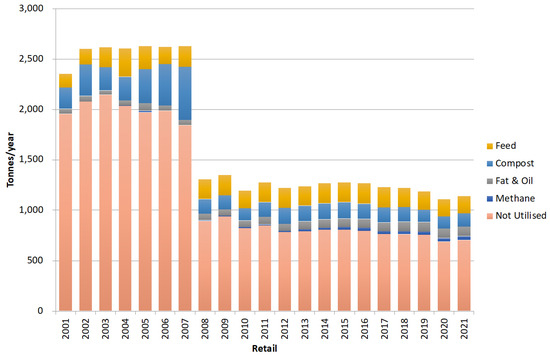 Amount of food waste from the retail sector by type of recycling (source: [15]).