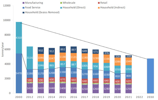 The upper part of the bar graph in Figure 13 shows the amount of avoidable food waste from households by category, and that from commercial sources is shown by sector in the lower part. Also, the estimated amount in 2000, the base year, as well as the target value for 2030 are shown. The Japanese authorities define avoidable food waste from households as comprising “direct disposal”, “excessive removal”, and “leftovers”. However, what is regarded as excessive removal may be edible, but they are parts that had been intentionally removed, and the authors do not consider this a priority component for the reduction target [30].