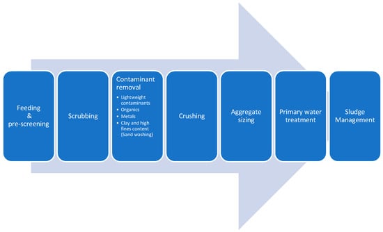 CDW is a diverse category that covers numerous materials, such as concrete, bricks, wood, glass, metals, and plastic. CDW also encompasses waste generated from the construction and demolition of buildings, infrastructure, road planning, and maintenance. While some components of CDW have high value, others can be reprocessed into new products or materials. Interestingly, recent research indicates that, on average, 95% of these materials are stored in buildings, while the remaining 5% end up in landfills []. Separating and recovering CDW is a well-established, readily available, and generally inexpensive process (Figure 1). However, hazardous materials such as solvents and asbestos can threaten the environment and require certain recycling efforts if not separated at the source.