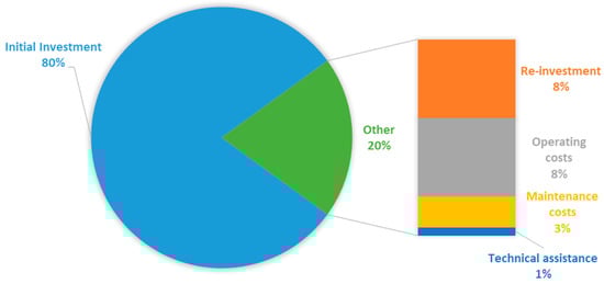 The percentage distributions of the costs are illustrated in Figure 2. The reinvestment requirements are assumed to be 1% of the annual investment cost. Operating costs include administrative costs of project and service provision and are estimated to be the same as the reinvestment cost, adding another 1% on top of the project cost per year. Operating costs are estimated based on the required personnel and average wage payments. The technical requirements include support from the service technology providers and consultation, along with other expenses for research and development, which is also estimated to be USD 400,000 in total for the program implementation time.