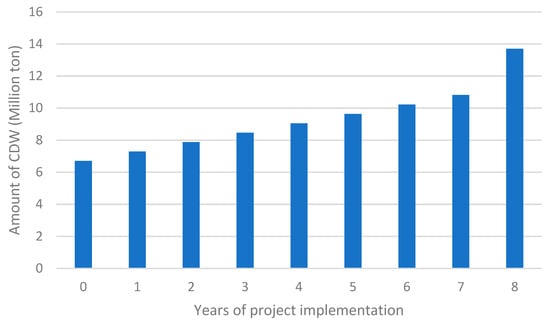 The key findings of this research indicate a potential to recycle up to 84 million tons of construction and demolition waste (CDW) over ten years, resulting in an annual 25% national capacity increase in recycling (Figure 4). Moreover, installing full-cycle CDW recycling centres in major cities will ensure up to 95% recycling efficiency. A net cost-discounted evaluation of the project has been calculated, which shows that the project would cost approximately USD 48 million. The project’s cost–benefit ratio is 0.59, indicating that its costs exceed its benefits. The payback period is estimated to be 9.91 years, indicating that the initial investment will be recovered within this period. Overall, these findings highlight the potential of the project to reduce CDW and contribute to a more sustainable environment while generating economic benefits for the stakeholders involved.