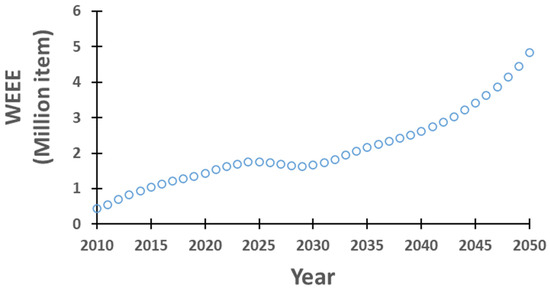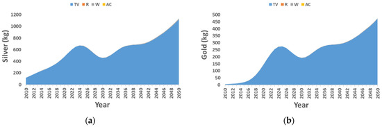 Precious metals such as silver and gold, on the other hand, are primarily present in low concentrations within the printed circuit boards (PCBs) of television sets and in the control circuits of other EEE. As shown in Figure 5, it is estimated that more than 600 kg and approximately 1130 kg of silver can be generated from the WEEE in 2022 and 2050, respectively. Similarly, gold content in WEEE will increase from 223 kg in 2022 to 475 kg in 2050.