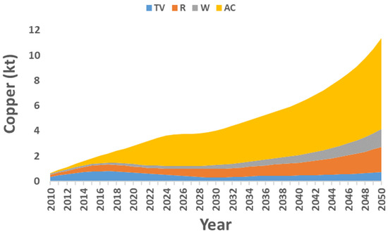 Similarly, it is anticipated that the weight of copper contained in WEEE generated during 2050 (11.4 kt) will increase by more than 3 folds compared to 2022 estimates (3.3 kt). The average copper content in the WEEE stream fluctuates around the mean of 6.3 ± 0.3%. Most of the copper comes from the disposal of AC units with a percentage of 61% in 2022, increasing to 68.2% before decreasing to 66.6% and 63.6% in 2030, 2040, and 2050, respectively. The copper contents in the discarded Rs and Ws are steadily increasing with time from 14.2% and 6.5% in 2022 to approximately 17.6% and 12.3% in 2050, respectively. Yet, the share of discarded TVs in the WEEE complex is projected to contain less copper in the future with a percentage falling from 18.1% to 6.4% between 2022 and 2050. More details are illustrated in Figure 3.