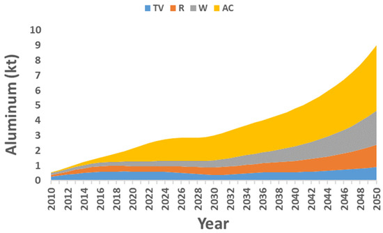 In contrast to precious metals, the percentage of plastics contained in WEEE is high. Its concentration comes after ferrous metals with an average 18 ± 0.8% by weight of WEEE. Plastics are used mostly in Rs, ACs, and TVs with a share percentage of more than 89% of the total plastics in WEEE. The projected quantities are shown in Figure 6. In refrigerators, plastic forms approximately 46.6 ± 3.6%, and it is used for door seals, drawers, lampshades, hinges, display panels, and shaft sleeves. More details about WEEE generation and material flow are shown in Table S1 in the Supplementary Material.