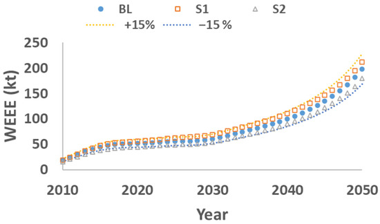 The potential amount of WEEE generated from the baseline scenario (BL) and the two additional weight and composition scenarios (S1 and S2) are shown in Figure 9. The waste generated from S1 is higher than the BL scenario. The maximum relative difference is 14.3% of the BL scenario. On the contrary, the WEEE predicted from S2 is lower than the BL scenario. The minimum relative difference is 14.9% of the BL scenario. The mean relative difference between the predicted waste from the BL scenario and that from the two scenarios is within ±10% of the BL scenario.