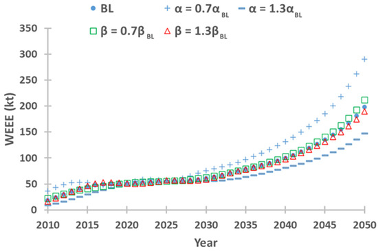 The effect of varying EEE lifetime Weibull distribution parameters (the scale parameter, α; and shape parameter, β) are investigated by taking ±30% of its original value in the BL scenario for each parameter. The forecast WEEE following the different scenarios is shown in Figure 10. It is clearly shown that the scale parameter greatly affects the generated WEEE. Increasing the lifetime of equipment, α, by 30% reduces the average amount of generated WEEE by 20% and 18.8% by number and weight compared with the BL scenario, respectively. The range of RD of the EEE disposed of using this scenario is −50.3% to +0.5% by number (−50.4% to −2% by weight). And vice versa, the waste is increased when the scale parameter, α, is reduced by 30%. On average, the RD of the number of EEE disposed of is 25.7% greater than the BL scenario. This corresponds to approximately 26% by weight. The maximum and minimum RD are 88.5% and −9.2% by number (93.5% and −7.2% by weight) compared with the BL scenario, respectively. This highlights the importance of this key parameter in estimating WEEE.