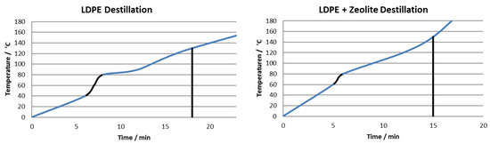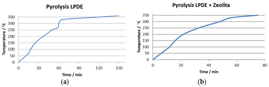 The pyrolization of LDPE was carried out in a homemade reactor. The reactor reached temperatures of 360 °C. The pyrolytic processes from LDPE to obtain oils and flammable gaseous products started at 65 min. The product obtained was as thick as beeswax and 90% of the product was obtained in about three hours. For LDPE + zeolite, the oil was obtained after 55 min at a temperature of 330 °C, and the process was completed only 20 min later at a temperature of 350 °C. A total of 75% of the product obtained was very thick oils. The graphs in