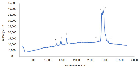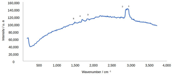 Raman spectroscopy was used to detect the bands of the hydrocarbons obtained from the distillation processes. In the case of putative hydrocarbons, Raman spectroscopy was used to determine the presence of carbon-carbon and carbon-hydrogen bonds. Furthermore, the stretching and deformation vibrations of these bonds can provide information about the structure and conformation of molecules. In aliphatic hydrocarbons, the Raman bands corresponding to the stretching vibrations of the C-C bond and in aromatic hydrocarbons, the Raman bands corresponding to the stretching vibrations of the aromatic rings usually appear in the region of 1400 to 1700 cm