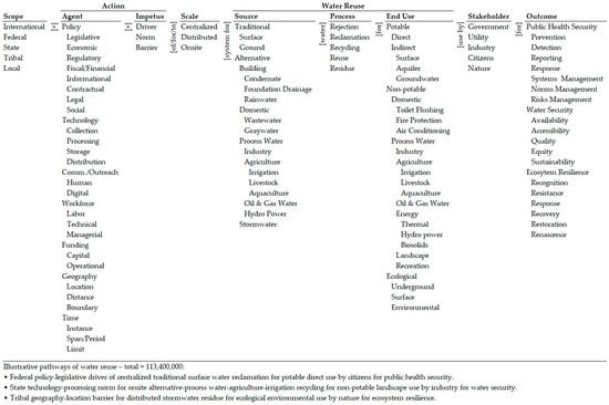 The ontology encapsulates 25 × 3 = 75 Agent–Impetus combinations. They include, for example, the following: (a) policy—legislative driver, (b) technology—processing norm, and (c) geography—location barrier. Thus, extending the earlier illustrations, one may have (a) policy—legislative driver of centralized traditional surface water reclamation for direct potable use by citizens for public health security, (b) technology—processing norm for onsite alternative process water agriculture–irrigation recycling for non-potable landscape use by industry for water security, and (c) geography—location barrier for distributed stormwater residue for ecological environmental use by nature for ecosystem resilience. In combination with the action combinations, there are 1400 × 5 × 18 × 3 × 75 = 28,350,000 pathways.
