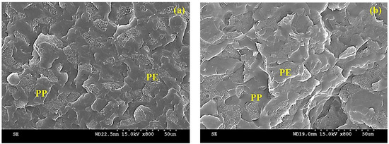 SEM image of (a) MPWS and (b) neat prime PE/PP—60/40 blend.