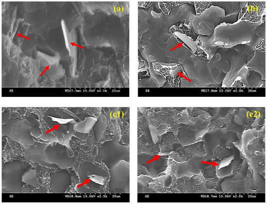 SEM images of 1 wt.%-FLG-filled (a) MPWS composite, prime PE/PP blend composite; (b) FLG premixed with PE phase, (c1,c2) FLG premixed with PP phase and the localization of FLG has been marked by the red arrow to guide the readers’ eyes.