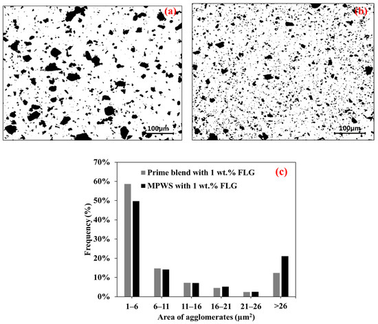 Figure 3a,b display the processed optical microscope images of thin film of MPWS and prime PE/PP composites, respectively, each containing 1 wt.% of FLG. Dark regions represent FLG particles and the white background represents the polymeric phases of the composites. Additionally, Figure 3c illustrates the frequency of FLG agglomerates as a function of agglomerate area in the composites to quantify the dispersion of FLG in MPWS and prime PE/PP blend. The grey bars represent the agglomerate size distribution in the prime blend composite, while the black bars represent the distribution in MPWS composite.