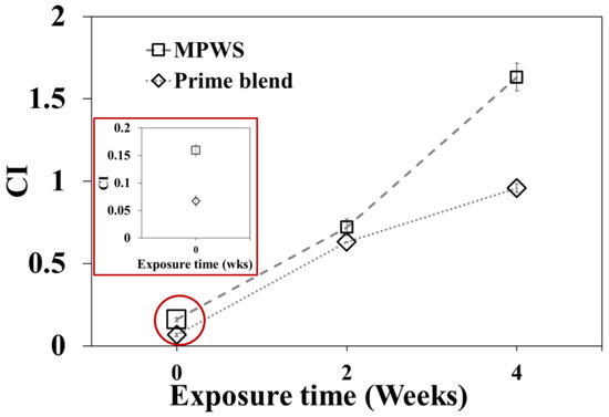 CI of prime polyolefin blend and MPWS as function of exposure time. Dotted lines are used to guide reader’s eyes.