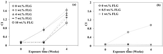 CI of (a) MPWS/FLG and (b) FLG-filled prime polyolefin composite as a function of UV exposure time. Dotted lines are used to guide reader’s eyes.