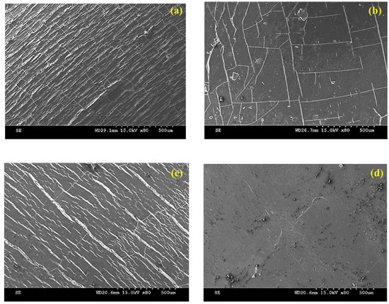 Figure 6a,b show the surface finish of unfilled MPWS and 1 wt.% FLG-filled MPWS composite, after 4 weeks of exposure to UV radiation. In addition, Figure 6c,d showcase the surface finish of both the neat PE/PP blend and the PE/PP blend composites with 0.5 wt.% FLG, after a 4 week exposure to UV light. As a result of photodegradation, numerous longitudinal and transverse cracks appeared on the surface of neat MPWS sample. Although several cracks are observed after UV exposure on the MPWS/FLG composite with 1 wt.% FLG, the quantity is considerably reduced when compared to that of unfilled-MPWS. Similar to the case of MPWS, many longitudinal and transverse cracks are evident on the unfilled and UV exposed prime PE/PP blend surface. However, in contrast to the FLG-filled MPWS composite, there are no visible cracks on the surface of FLG-filled prime PE/PP blend composite. These observations suggest that even an FLG concentration as low as 0.5 wt.% is adequate to provide satisfactory UV protection to prime PE/PP, although not to mixed polyolefins waste-based compounds. The likely reasons for this are discussed in the subsequent section of this work.