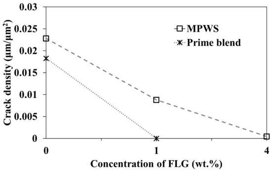 To have an overview of crack formation, the crack density on the surface of UV-exposed samples has been calculated. Figure 7 shows crack density of FLG-filled MPWS and prime blend composites, after 4 weeks of UV exposure, as a function of FLG concentration. Photodegradation-driven crack density on the surface of UV-exposed MPWS compounds decreases as the concentration of FLG is increased in the composite. A concentration of FLG > 4 wt.% can effectively prevent crack formation (SEM images of the corresponding samples, Figure S1a,b, are provided in the Supplementary Information Section). On the other hand, 1 wt.% FLG is considered sufficient to prevent crack formation on the composite surface during UV exposure. These observations indicate that the presence of FLG slows down the UV degradation of polyolefin blends.