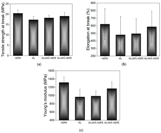 Mechanical properties of marine plastic litter containing varying percentage of HDPE (0–40 wt%) compared with those of virgin HDPE. (a) Tensile strength at break; (b) elongation at break; (c) Young’s modulus. Adapted from [71].