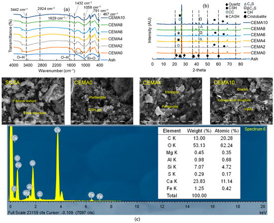 The surface morphology in Figure 2c suggests that the SCSA particles were long strips, revealing the presence of layers of loose SCSA flakes. Moreover, the elongated segments (high-intensity values) suggest the predominance of SiO2, and the particles’ irregular form proposes the amorphous nature and high porosity of SCSA. As such, the SCSA material could seal the voids around the cement particles. In a comparable study, the SEM of rice husk ash showed a flaky morphology with a loose surface, assigned to the preparation of an amorphous and active ash-based material [8]. As such, the CSH gel formed from the pozzolanic reaction of SCSA could fill the voids existing between the cement and sand particles [4]. The presence of some pores suggests that higher fractions of SCSA could be responsible for increasing the water absorption capacity of the mixture (i.e., workability reduction). The CEMA0 surface morphology showed angular, comparatively loose, and irregular cement particles, forming plate-like shapes. This sheet-like CSH could refer to the presence of cement minerals, such as Portlandite. The mixture becomes denser following a 2% cement replacement with SCSA, which could be ascribed to the developed bonds between Ca(OH)2 and the silica content during cement hydration [8]. Some elements, such as iron, magnesium, and silica, appeared after ash supplementation, denoting that the fine ash was involved in filling the voids between the cement particles and aggregates (i.e., reducing the number of pores in the cement matrix). The presence of clusters of CSH gels and ettringite crystals (which acted like a bridge between the cement particles) might have improved the connections in the cement matrix, as previously demonstrated [34]. More voids and cracks began to develop for CEMA6 to CEMA10, which could be responsible for hindering the hydration process to a large extent. Although the ash content in these mixtures is beneficial as a pozzolanic material, the gaps and boundaries (represented as a honeycomb structure) between the mixture components could increase the water absorption capacity and act as a barrier to effectively transferring the load [14]. It was deduced that the presence of voids in the cement morphology affected its mechanical properties; consequently, a downward trend in the CS values occurred for CEMA10.