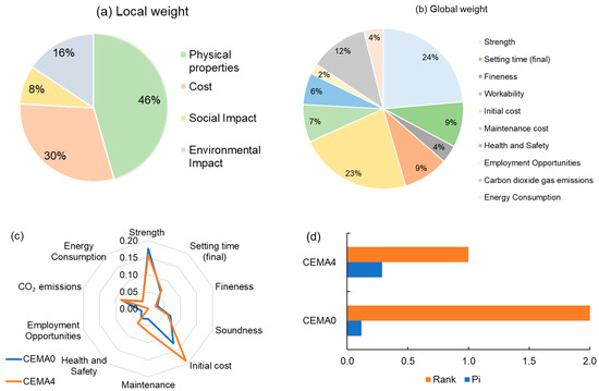 Results of AHP-TOPSIS method for selecting the best alternative between the control sample (CEMA0) and the optimum mixture sample using four-pillar perspective (physical performance, social impact, cost, and environmental impact): (a) local weight, (b) global weight, (c) distribution of ideal solutions, and (d) alternative ranking.