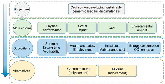 The MCDM framework was selected as a robust and flexible tool to determine the best alternative (e.g., appropriate cement mixture) using several indicators. As such, a multi-layered hierarchical structure (from the top to the bottom; Figure 5) was constructed to display the connection between the objective, criteria/sub-criteria, and final alternatives. The main objective was to identify if it is better to recycle SCSA in the cement-manufacturing industry compared with CEMA0, regarding the achievement of several different criteria. The aim of developing green cement-based materials was broken down into several levels (hierarchical decomposition), where the first step was to define the main criteria. These criteria were denoted as mechanical/physical attributes, cost, societal impact, and environment, and they were described by a total number of ten sub-criteria (see Supplementary Table S7). The input data for the mechanical/physical category were obtained from the experimental study, using the 2–10% (w/w) SCSA replacement ratios. For other criteria (economic, social, and environmental), and their sub-categories, pairwise comparisons at the criterion level were assigned through questionnaire-based research. This step was developed by a number of specialists in the cement-manufacturing industries, involving fourteen operating plants situated within different provinces in Egypt. A questionnaire sheet (see Supplementary Table S8) was distributed to the experts of different Egyptian cement industries and the associated data were gathered, analyzed, and reviewed. Four specialists and experts were selected at each cement plant to answer the questionnaire, giving a total number of fifty-six in the survey. Further, the input data were compared pairwise to define the degree of importance of the criteria used in the AHP decision-making model. The relative importance values were defined on a nine-point (1–9) scale, recognized as “Saaty’s Fundamental Scale” [62] (see Supplementary Table S9).