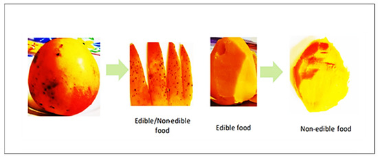 Fruits and vegetables (VFs) can be eaten for nutritional well-being [16]. Rich in essential nutrients, including vitamins, minerals, and antioxidants, FVs can reduce malnutrition by addressing dietary deficiencies. Their high fiber content aids digestion and regulates blood sugar levels. At the same time, their hydration properties prevent dehydration, which is crucial in regions such as SSA with limited access to clean water. Moreover, these foods boost immune function and reduce the risk of chronic diseases such as heart disease and diabetes. Additionally, their affordability and accessibility make them practical solutions for improving undernourishment and overall health and well-being. Fruit is the edible fleshy/succulent part of some plants, which can be sweet or non-sweet in its raw form [14]. On the other hand, vegetables are the edible portions of a plant that can be eaten, such as leaves, stems, tubers, roots, and bulbs. The inedible parts of fruits and vegetables constitute the peels, stalks, pulp, leaves, pomace, and seeds, as shown in Figure 1. Classifying food as edible or inedible is based on various reasons. For example, blemishes in the skin of some fruits, as shown in Figure 1, and agrochemicals from conventional agricultural production have potential health risks, often leading to non-consumption and discarding due to social or cultural reasons.