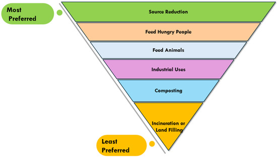 Thus, valorizing material from FW contributes to or enables a CE concept that seeks to keep raw materials (such as farm produce) in a closed-loop system [60,61,62]. This maximizes resource use, reduces the need for new resources, avoids waste, and extends the product life cycle [63]. Several authors, scholars, and institutions have conceptualized a food recovery hierarchy, summarizing conventional and alternative FW management methods to promote sustainable FW management, as shown in Figure 3. The model’s preferred actions are “prevention and reduction” and “repurposing and recycling”, while “landfilling or incineration” is the least preferred.