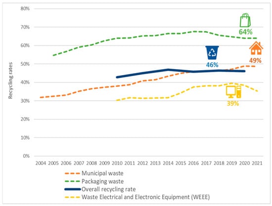 Currently, the MSW recycling rate is constantly increasing in all 27 EU member states. This reality reveals continuous progress in the reuse and recovery of generated waste—as valuable resources and raw materials—and, consequently, the growing interest of all EU countries in adopting the sustainable circular economy model. According to the official websites of the European Commission and the European Environment Agency, the overall recycling rate in the EU territory ranges between 46 and 49% of the total annual generated amount of EU MSW (including composting). In addition, each of these municipal waste streams presents specific and differentiated recycling rates. In the EU, packaging waste is recycled at a rate of 64%, Waste Electrical and Electronic Equipment (WEEE) at a rate of 39%, and municipal waste at a rate of almost 49%. Figure 1 below shows the recycling rates of some basic waste streams as they evolved over time [,].