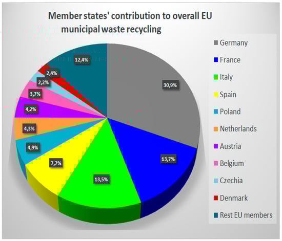 Member states’ contributions to the total amount of recycled municipal waste in the EU [,,].
