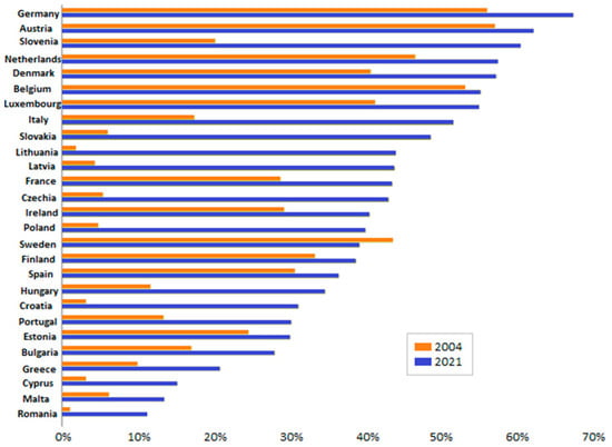 Municipal waste recycling and composting rate diagram of all 27 EU member states for the years 2004 and 2021 [].
