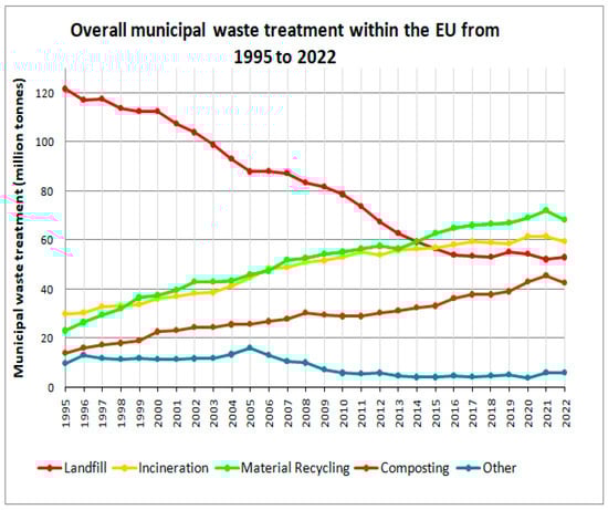 According to the latest recorded and formally published municipal waste treatment and management information for the year 2022 for the EU, 68 million tonnes, or 30% of the total annually generated municipal waste within the EU, was recycled, while 43 million tonnes, or 19% of the total annually generated municipal waste, was composted. Additionally, during the same year, 53 million tonnes, or 23% of the total annually generated municipal waste, was landfilled, and 59 million tonnes, or 26%, was incinerated either for energy production purposes or for other reasons. Lastly, 6 million tonnes, or 2% of the total generated municipal waste in 2022, was recorded as missing data or treated by other formal or informal means. Actually, these numbers and percentages show that, from 1995 to 2022, the overall municipal waste treatment general framework within all 27 EU member states significantly changed and moved to more sustainable pathways. Specifically, annual municipal waste landfilling was reduced by almost 56% from 1995 to 2022, while annual municipal waste recycling almost tripled from 1995 to 2022. In the same time period, annual municipal waste incineration almost doubled, while municipal waste composting processes skyrocketed by almost 207% within the EU.